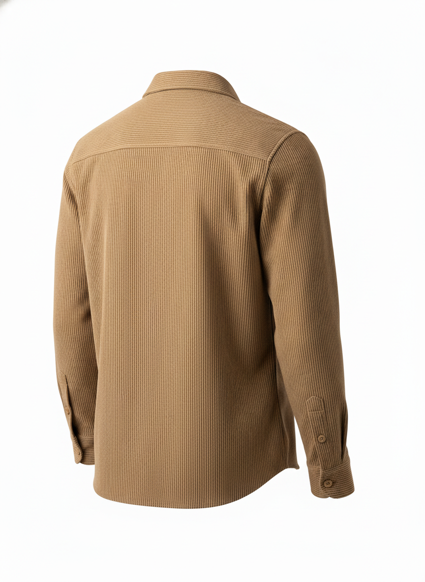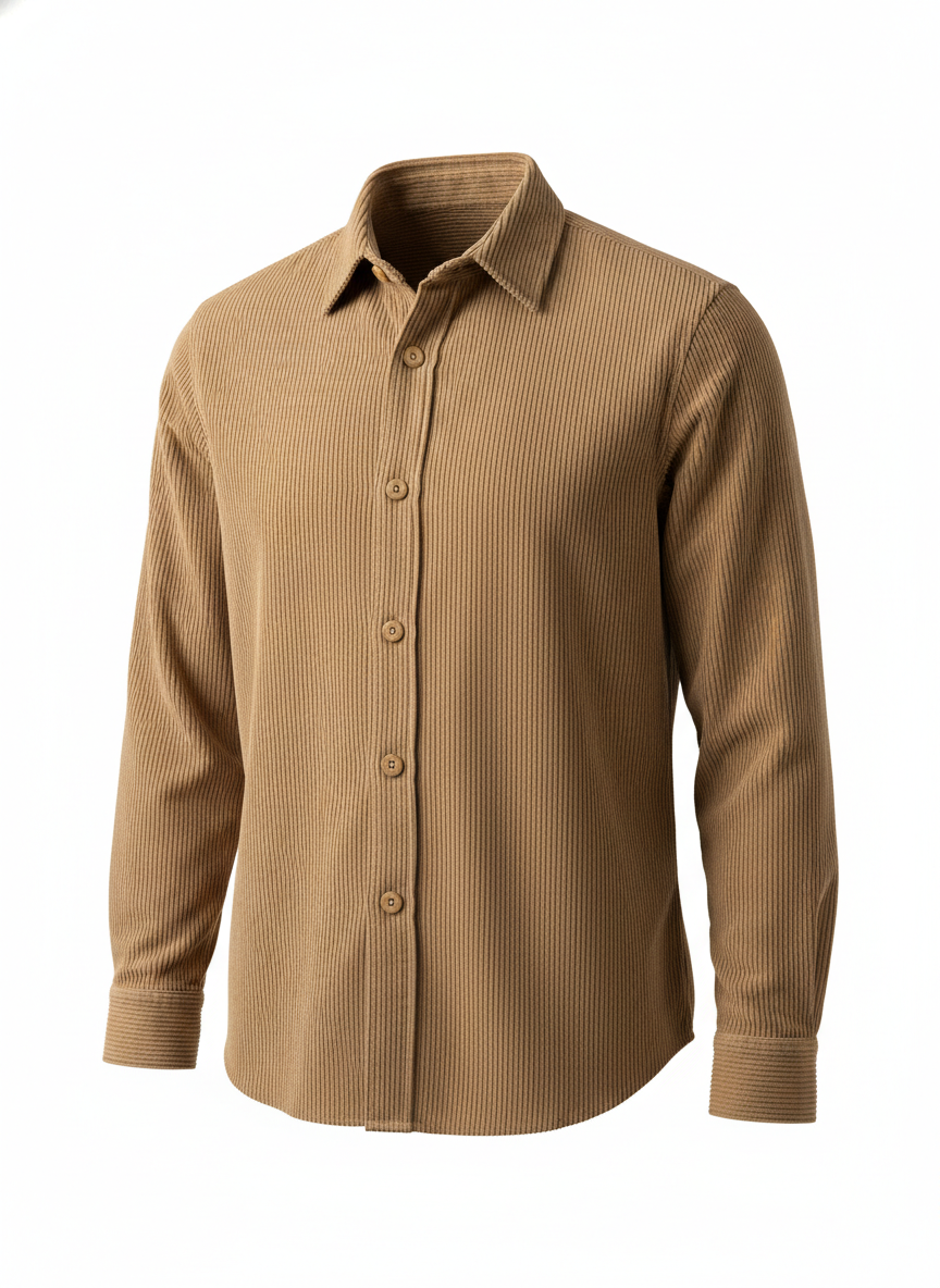 A corduroy shirt that has a vertical rib texture in a brown color. The shirt has matte plastic buttons and cuffs that can be adjusted for a fit. The fabric weight is enough to be worn as an overshirt or a standalone top for the autumn season.