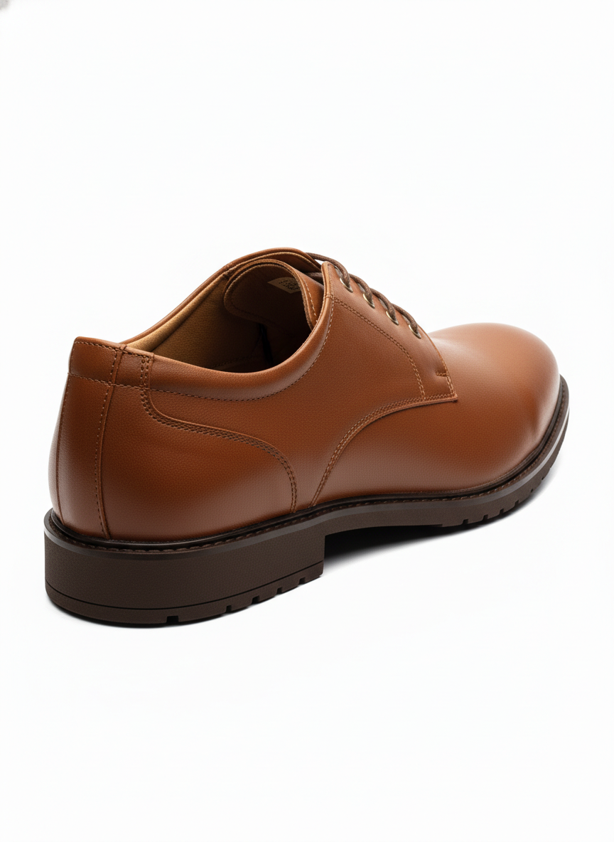 These shoes have a lace-up layout in a brown synthetic finish. The upper material is a synthetic blend, and the sole is a standard hard rubber. It has a simple round-toe shape for a routine look.